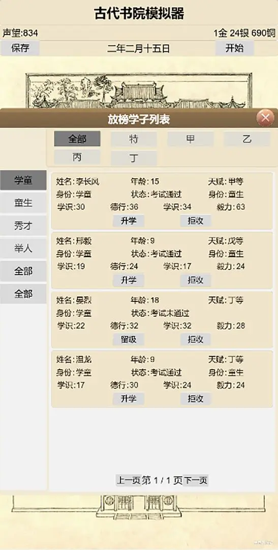 1、模拟古代开书院的休闲游戏,在游戏里,你可以自由招收资质各异的门生。