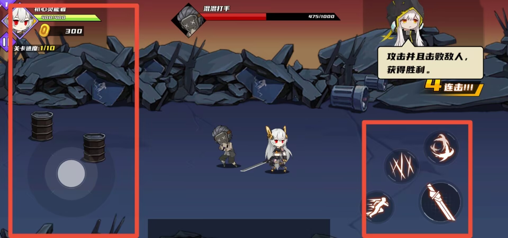 2、通过主页出发按钮进入关卡后,左侧界面显示生命值与移动摇杆,右侧为技能按键,顶端呈现敌人血条状态。