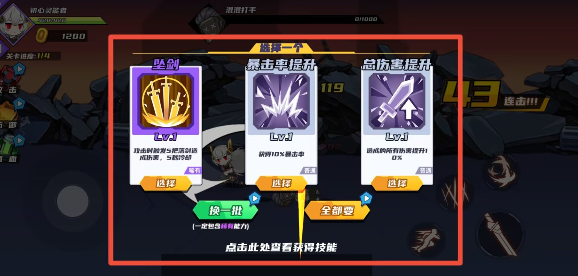 3、成功击败特定数量敌人后,系统将提供三个随机技能选项供选择强化,不满意可刷新替换。