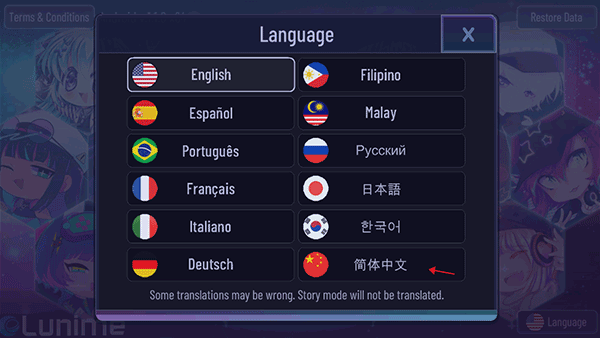 1、首先打开加查霓虹灯最新版,游戏内如图,点击右下角Language;