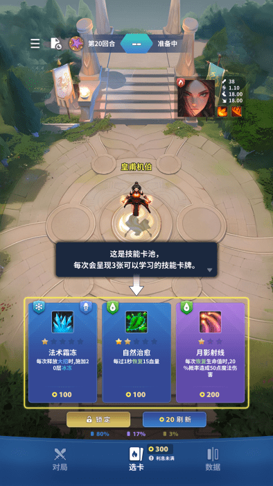 这是三个技能卡池,分为蓝紫橙。每个卡牌都有流派的显示,如果没有可以进行刷新。