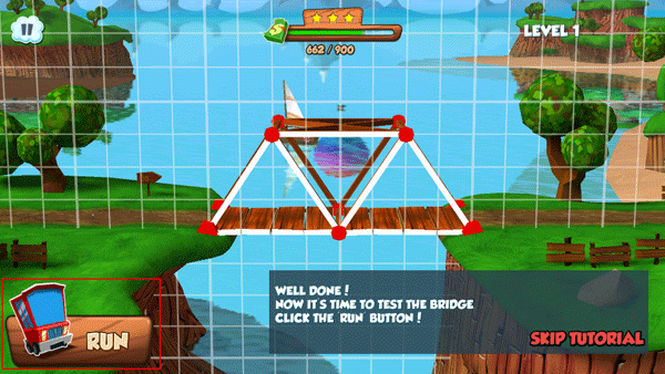 4、铺好之后点击左下方的“RUN”,让小火车安全通过你搭建的桥梁就行了。
