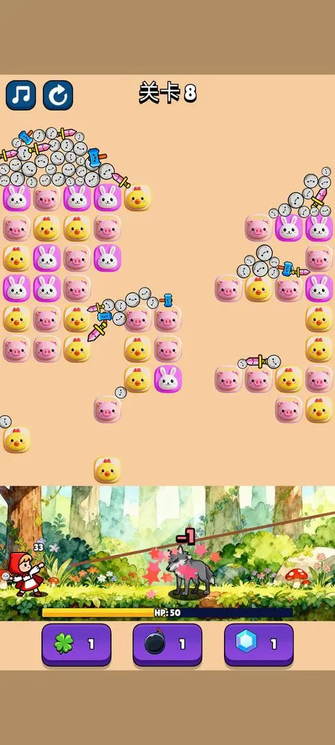 1、角色小红帽将自动拾取并朝大灰狼发起进攻,每次攻击消耗一件武器,伤害值与武器类型挂钩。
