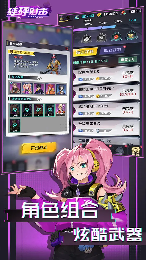 砰砰射击是一款内容非常有趣的以丧尸作为主题的动作射击类游戏,其中玩法内容非常的精彩有趣,你需要做的就是在其中不断进行战斗,让自己可以更好的存活下去,其中的内容非常的精彩有趣,多种不同的关卡内容可以选择,整体的任务内容非常的精彩有趣,完成其中的任务可以获取到丰富的奖励,其中多种不同的角色可以进行选择其中的角色具有自己独特的武器可以进行使用,让你可以合理进行小队的搭配。