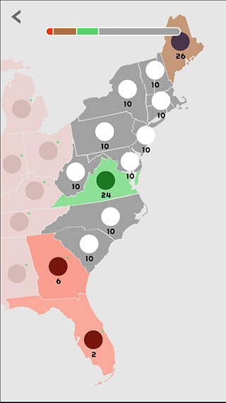 3、点击拖动地图块中间的圆点,即可表示派遣单位进行攻击扩张,圆点旁边的数字表示单位数量,单位数量会随着时间自动增长,数量越多,地图块的颜色也就越深。