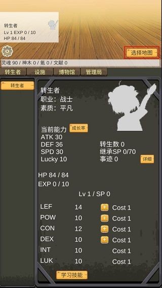 3、有了转生者,你可以在屏下左侧栏查看转生者的能力,接着就是把他分配到异世界去。点击屏上右下角的“选择地图”按钮,并且选择World1和Map1。