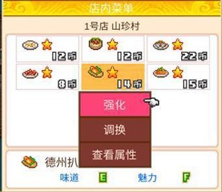 “强化”是另一种增强菜品属性的方式,选择菜单-餐厅菜单-菜品设置-店内菜单,选中希望增强的菜选择“强化”选项。在食材列表中选择消耗一份食材对菜品进行增强,注意强化完成后食材就会消失,所以尽量选择契合度高又有富余的食材来进行强化吧。