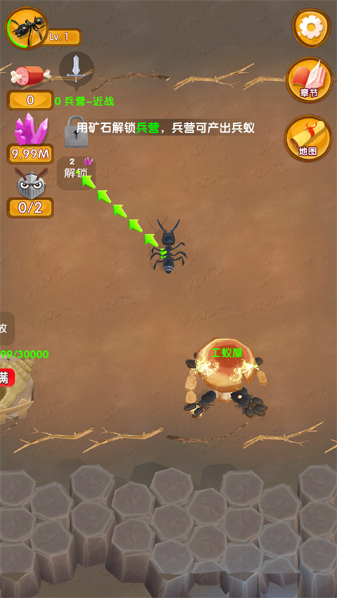 1、收集物资,建造你的蚂蚁家园,扩大蚂蚁种群势力。