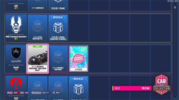 如图,车辆图标右下角显示的是车辆的性能等级,左边则是它的驱动类型,比如前置后驱、后置四驱等等。选中车辆时,左边的“GT CARS”则代表车辆的分类。