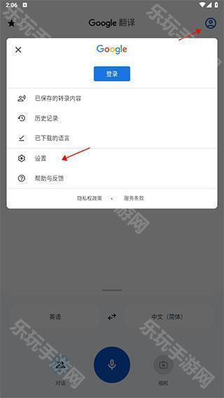 1、进入谷歌翻译器首页点击右上角进入,选择设置