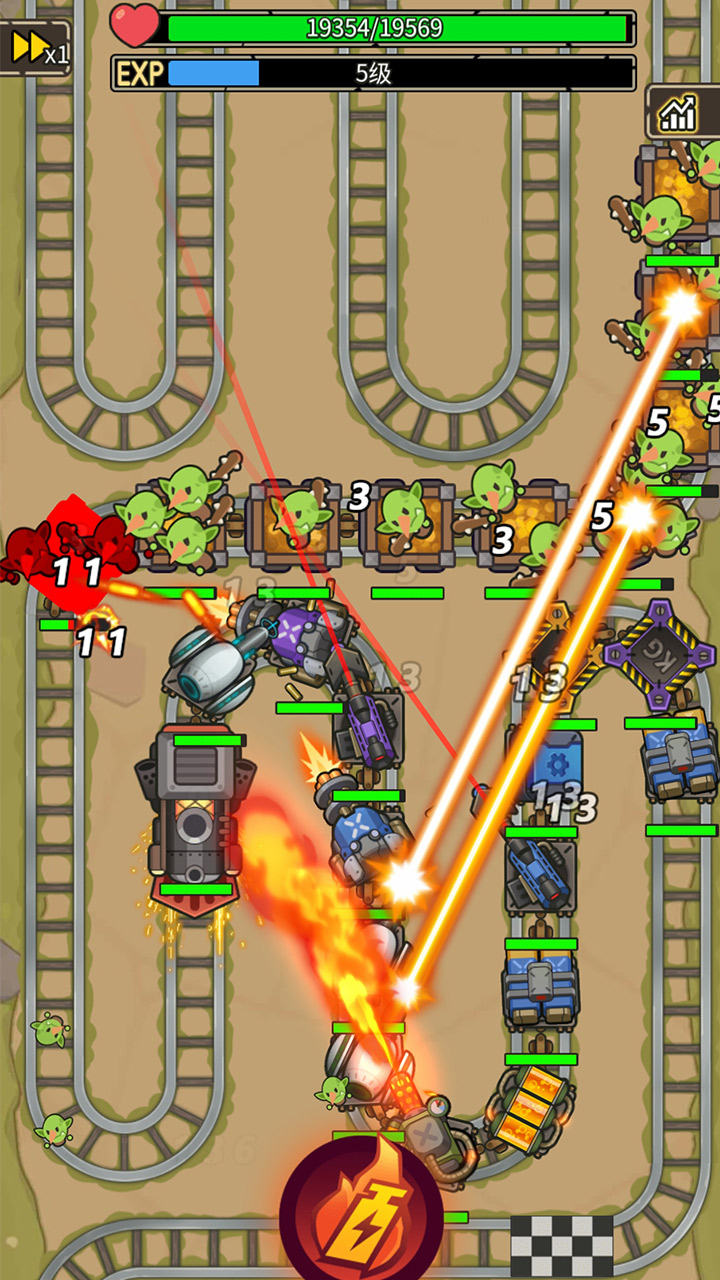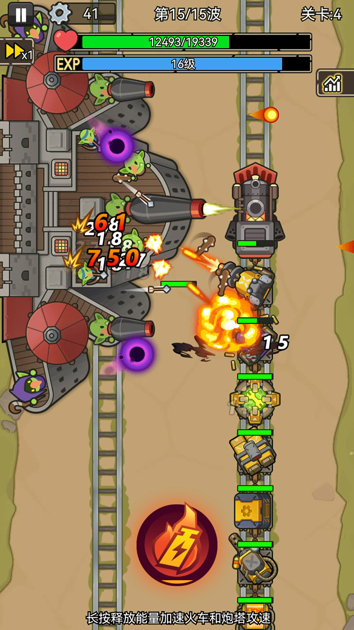 3、放好炮塔后点击开始战斗火车会自动前进,车厢上的炮塔也会自动攻击,点击屏幕中间的按钮可以加速火车和炮塔攻速。