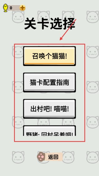 2、在关卡选择界面,点击【召唤个猫猫!】按钮,进入游戏关卡。