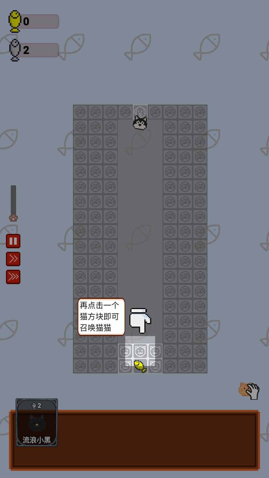3、进入游戏关卡后,根据提示,点击猫方块召唤猫猫,利用猫猫守护鱼干,完成游戏任务,推进游戏进程。