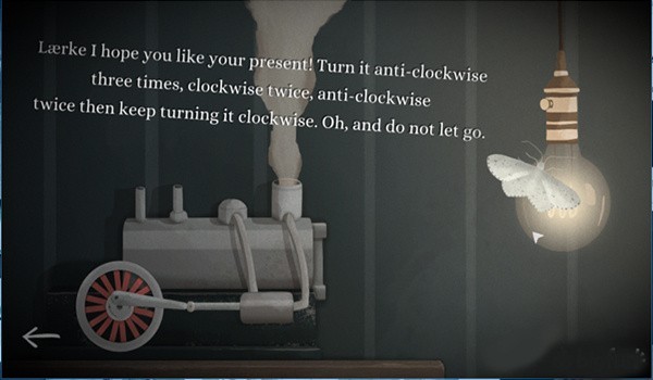 3、进入别墅后,此时玩家1看见的是蒸汽火车和点灯;玩家2看见的是一个小丑盒。玩家1转动蒸汽轮并点亮点灯,会出现一行提示转动方向和次数的文字,玩家2需根据此段文字进行小丑盒的操作,并得到车票的左半边。