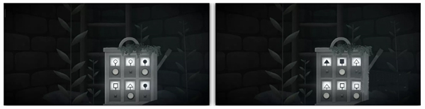 井下方的谜题板的样式和玩家2是相同的,不过内容是相反的,即玩家1的中上、左下、右下三个图案是不可切换的,而玩家2恰好相反,左上、右上、中下三个图案不可切换,所以这里只需要和对方按图案位置说出自己不能更改的图案即可。