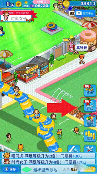夏日水上乐园物语最新版是一款像素画风的模拟经营游戏。玩家可以尝试各种公园活动,还有一些温暖有趣的主要任务来体验。每个玩家都有自己专属的水上乐园,享受独特又丰富的乐趣。通过在不同地方放置各种设施来吸引更多顾客,有很多特别的要求需要尽量满足。可以用一些营销手段来吸引更多客户而社交媒体平台则是积累人气的好去处。