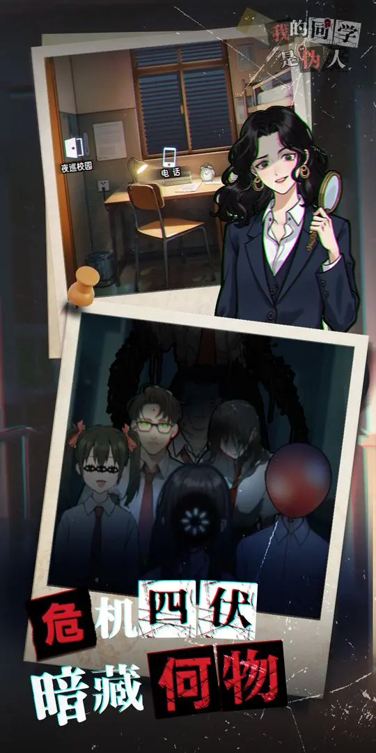 我的同学是伪人是一款策略卡牌战斗2D迷宫探索的轻解谜游戏。玩家现在开始扮演校园保安,潜入危机四伏的校园。白天进行校风纠察,揭露潜藏于其中的伪人。夜晚则巡查校园,以策略搭配不同装备,直面伪人的挑战,展开激烈战斗。高燃战斗、丰厚道具、卡牌养成、随机事件以及群像叙事,相比传统恐怖游戏,本作增添了更多动态身份博弈元素。出场角色多达八位,各具特色,为玩家带来独特互动体验,让剧情瞬息万变。