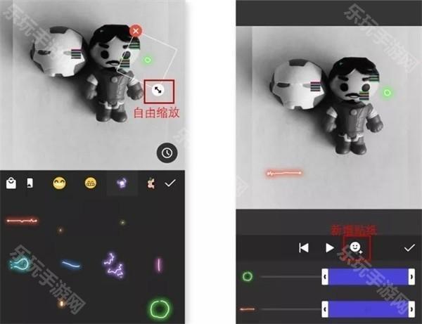 右图所示,在「播放时间条」上双指开合可以缩放贴纸整个播放时间长度,最后打钩即可完成。