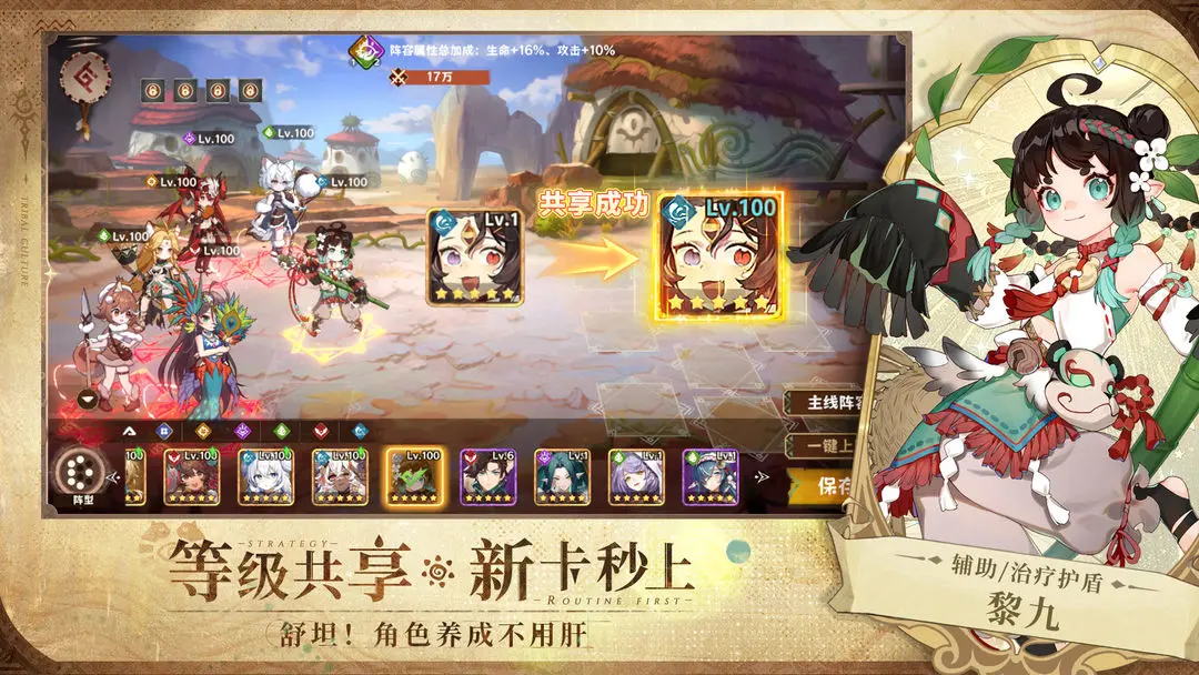 1、等级共享轻松提升战力水平,彻底拒绝爆肝提升等级完成各方面的养成,每位角色都能轻松点击完成简单的属性培养。