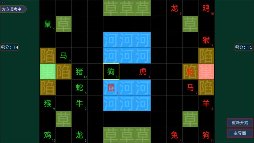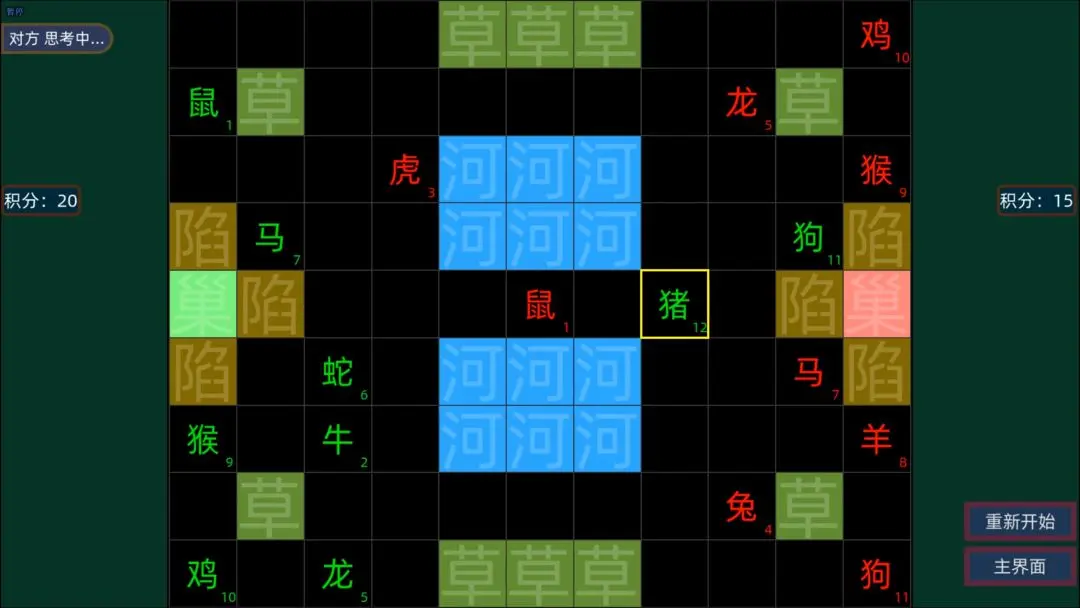 2、十种动物角色各具特色技能,模拟棋类对抗规则,在固定棋盘上进行策略对决。