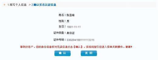 2、步骤二:进入信息确认页,确认无误点击“确认”按钮,否则点击“返回”按钮进行修改