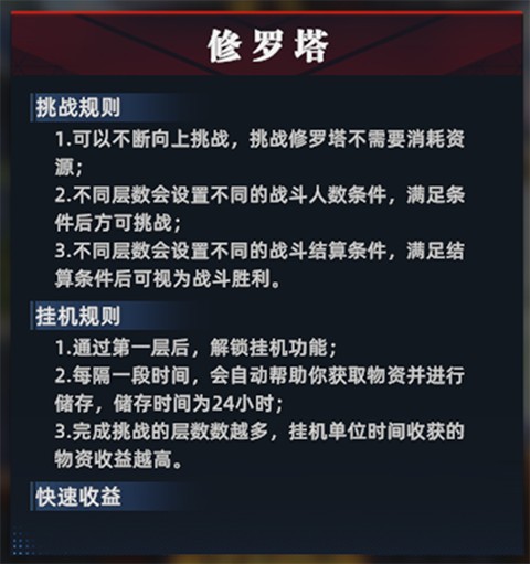 修罗塔主要产出装备精练、装备增幅所需要的各种材料,当玩家成功通过修罗塔第一层后,即可解锁挂机功能。这一功能十分实用,每隔一段时间,系统会自动帮助玩家获取物资并储存,储存时间为24小时。而且,完成挑战的层数越多,挂机单位时间收获的物资收益越高。