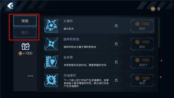 2、这里分别由游戏的技能和能力,玩家都是可以通过金币解锁的;