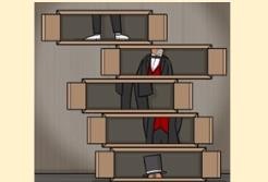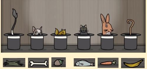 13、第十三幕:将正确的食物放入藏着不同动物的魔术帽中。动物从左到右分别是牛、狗、松鼠、猫、兔子、猴子。