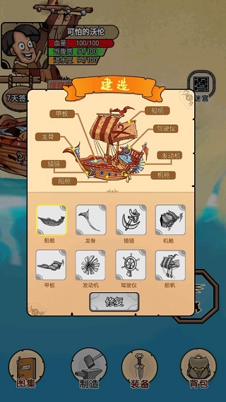 6、往后的类似操作差不多都是这样,点击修复可以查看材料,点击背包里的食物可以补充血量、饱腹感和喝水度。