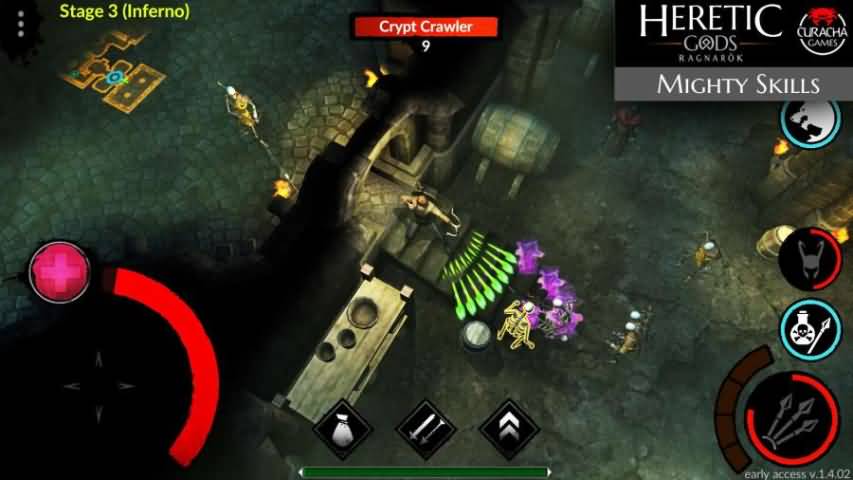 1、异教之神的控制系统是直观的,是很好的适应触觉设备,在屏幕左边有虚拟十字线,你可以移动你的角色,而右边的按钮可以攻击和使用技能,只要按下攻击按钮,你的英雄就会自动瞄准最近的敌人。