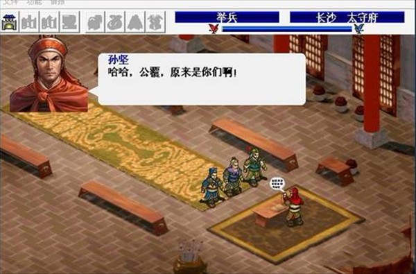本关很简单,孙坚一出现不像是作者说的那样降防御和士气是孙坚靠近了那个贼首才降他防御,这关一共有5个豆,左边的那个村庄没有豆,不用过去,杀死贼首得太平清领道 。