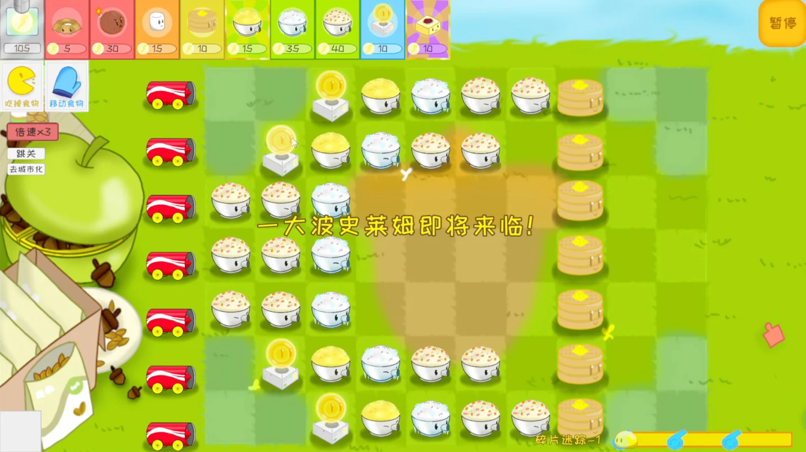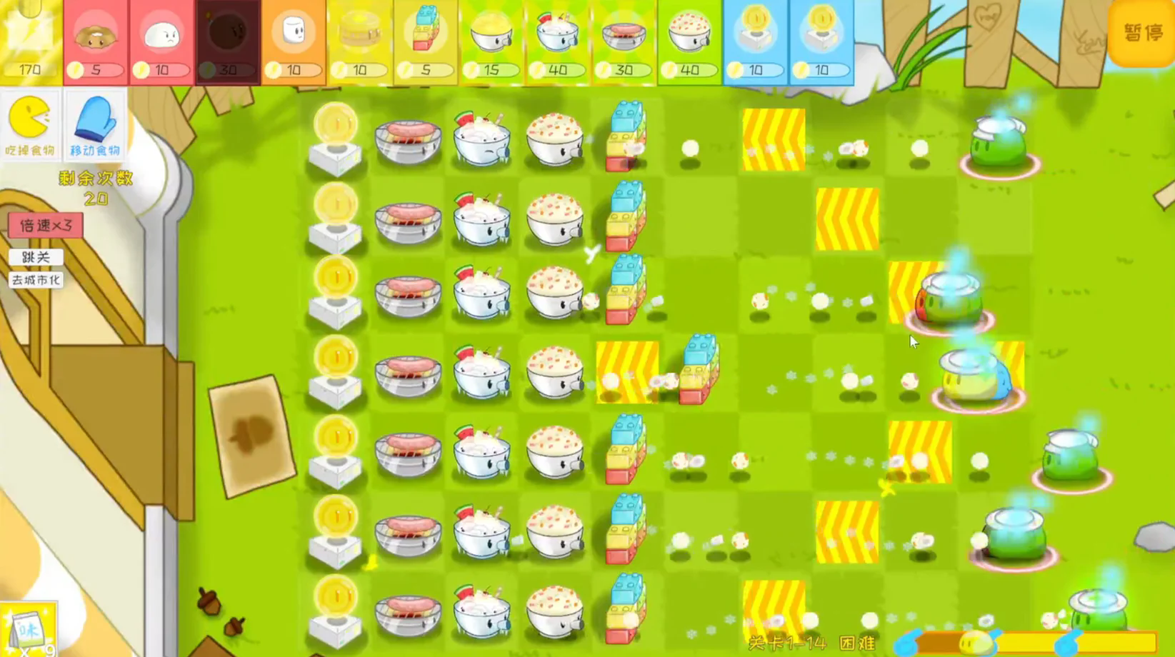 食物大作战是一款类pvz游戏。玩家作为一名探险者,在一次旅途中意外被传送到了一个正在发生史莱姆异变的美食世界。在这里他和幸存者厨神埃尔夫、魔法师李斯瑞还有从幻想乡赶来的灵梦和魔理沙等伙伴一起探索,最终找到了异变的根源,让这个美食世界恢复了往日的秩序与美好。为了统一咕噜画风,那位恶毒女巫居然偷走了所有蛋宝宝,还把它们放到了咕噜太空,真是让人无语。
