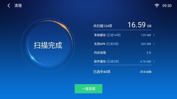 在首页点击“清理”,就可以扫描电视中的垃圾,点击“一键清理”;