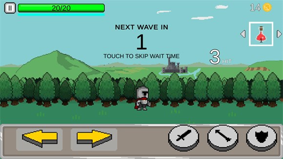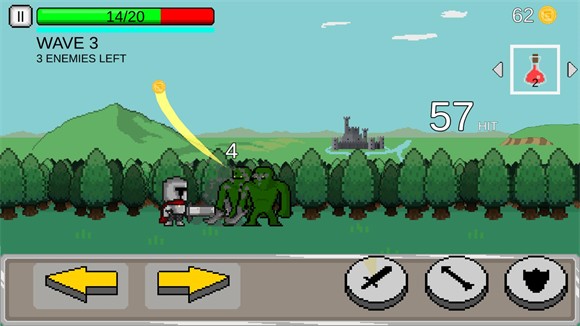 2、进入关卡后点击左侧的按钮控制角色移动,右侧的按钮是使用长剑、弓箭、防御。
