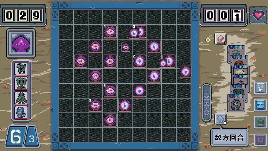 3、需要通过放置魔物砖块来填充棋盘,并通过特定的策略销毁敌人的砖块。