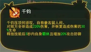 首先来看到辣椒·吕布怒气技能千钧,对敌方全体造成220%伤害,并恢复造成伤害的30%生命,施放技能后3秒内自身霸体且增加20%攻击防御。技能可以对敌军全体造成非常高的伤害,最重要的是还能够回复自身生命值,使其可以当输出的同时,还能够当前排去抗伤害。