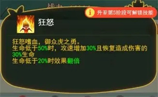 四技能狂怒,当辣椒·吕布生命低于50%时,攻速增加30%且恢复造成伤害的30%生命,生命低于20%时效果翻倍。可以让吕布更好的获得续航效果,使其能够稳稳的站住脚跟。