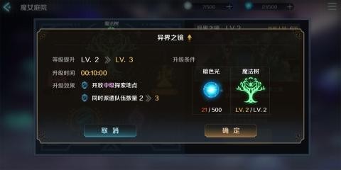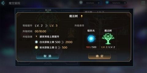 魔法树是魔女庭院的核心,魔法树升级需要在萤火灯台收集得到的暗色光。升级后白光和彩光获取上限会提升,其他魔女庭院中的建筑等级上限也会随之提升。