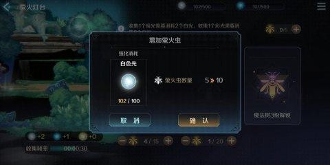 这三种光分别可以在魔法树1、2、3等级时进行采集。采集1个暗光需要消耗2个白光,采集1个彩光需要消耗8个白光。采集的时候需要分配采集各色光的萤火虫,萤火虫初始数量为5,后续可以通过消耗采集的光来增加数量。