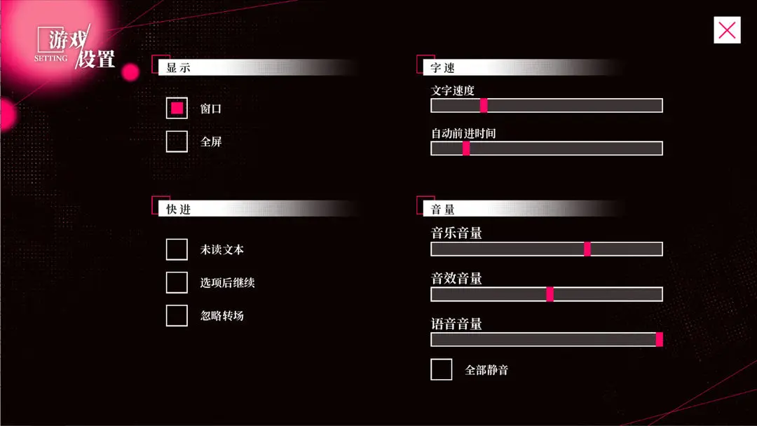 1、首次进入游戏时,建议先点击主界面的【设置】选项,根据个人习惯调整音量、文字速度、自动播放等参数,以获得更舒适的游玩体验。