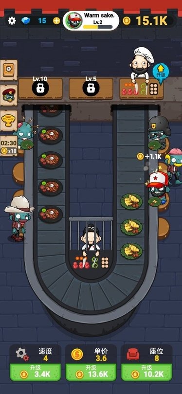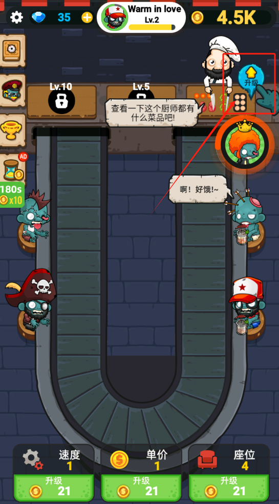2、给厨师点升级,看看他会做什么菜,注意传送带上僵尸顾客的用餐需求。