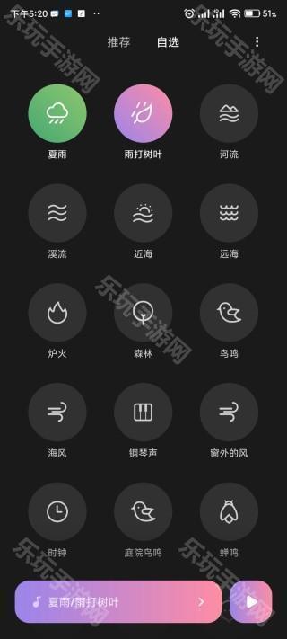 而小米白噪音就做到了,“自选”板块中提供了丰富的白噪音素材,有夏雨、河流、溪流、鸟鸣、海风、火车、钢琴声等等...