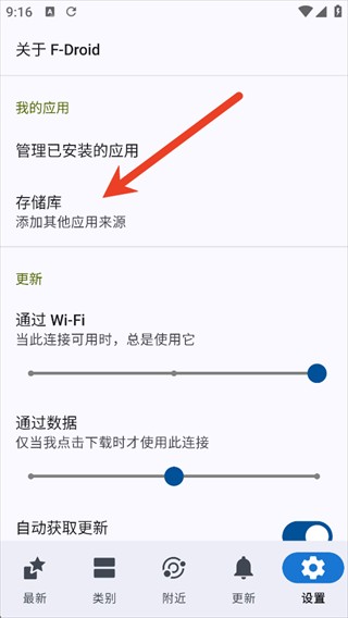 1、首先进入F-Droid后点击下方设置界面,进入储存库。