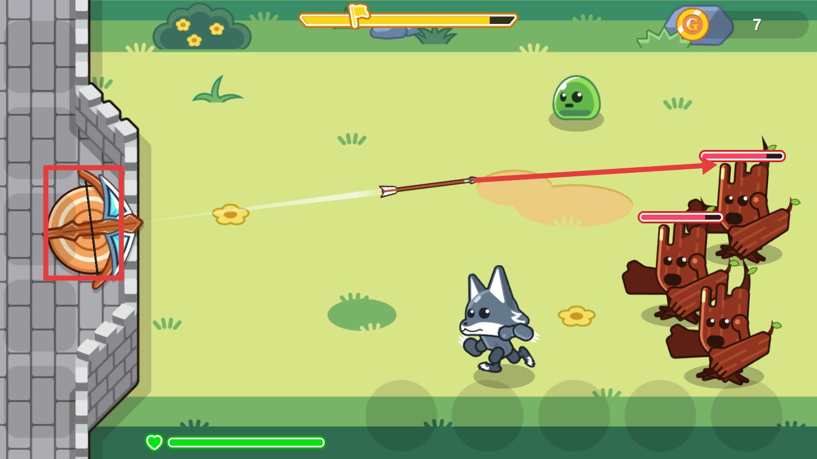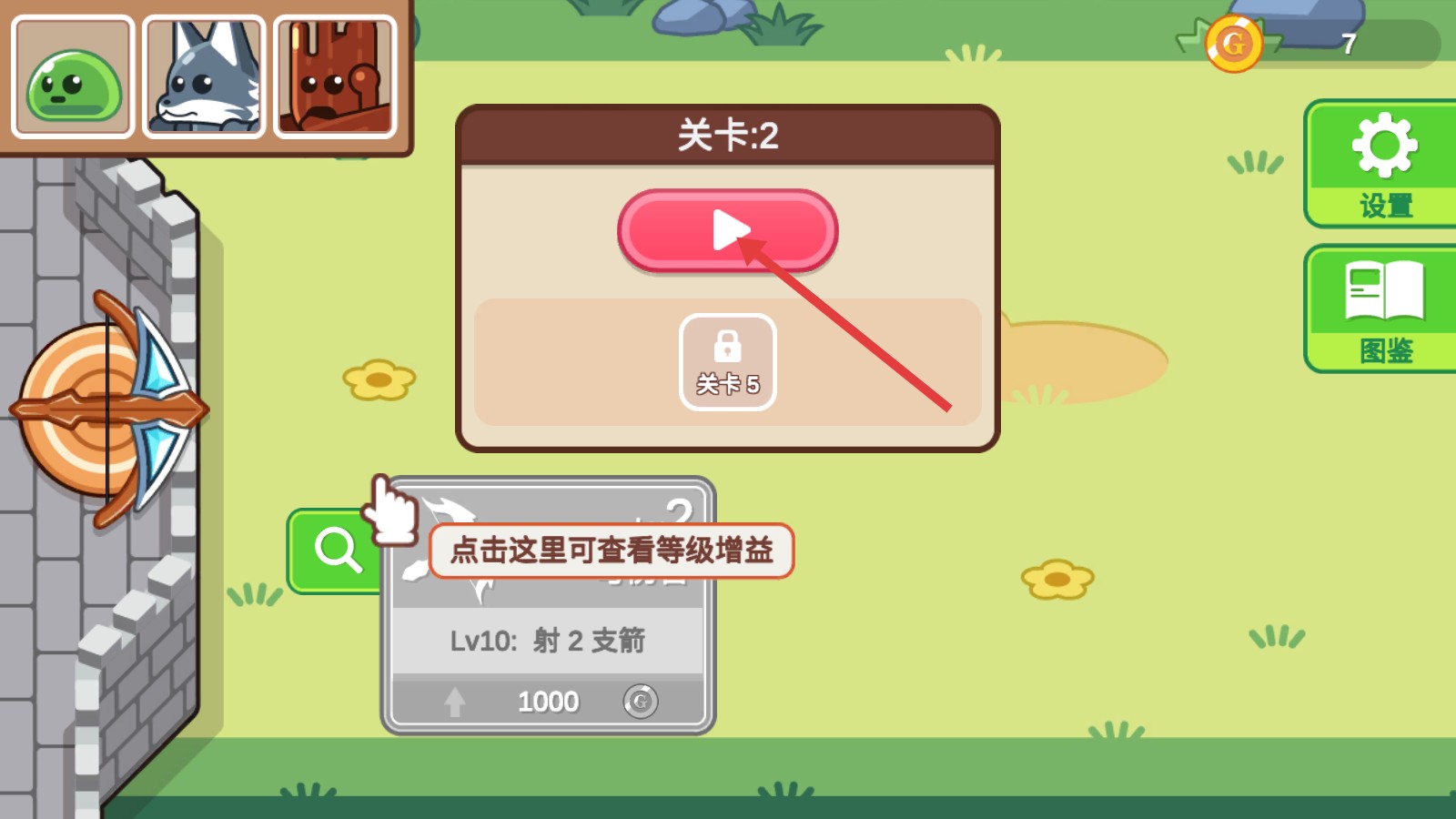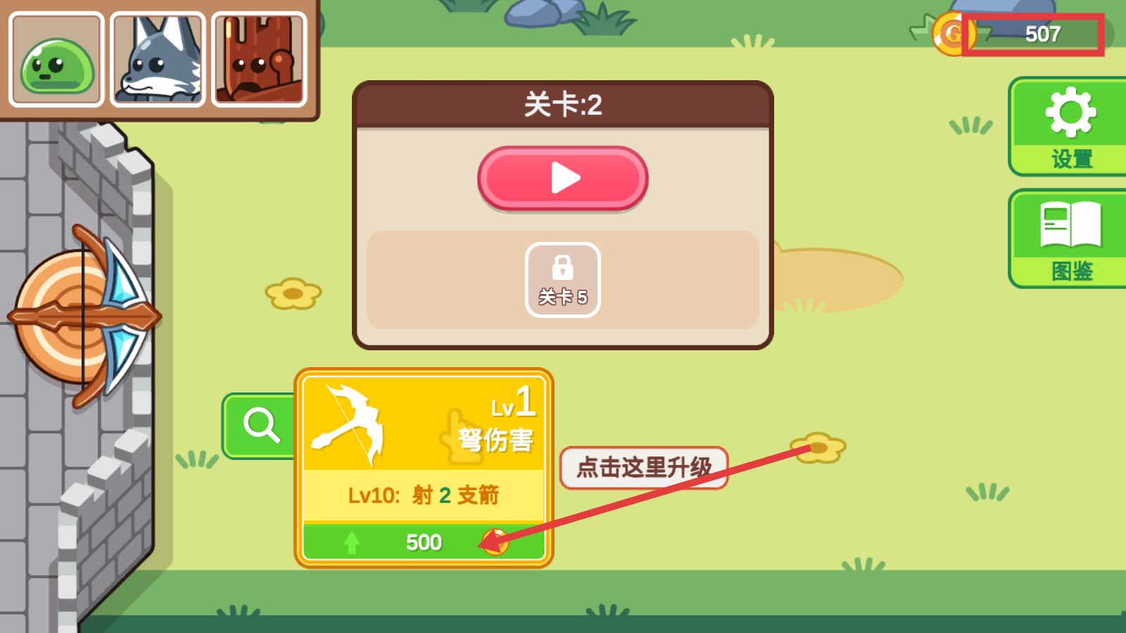 1、拥有【507】金币时点击【弩伤害】升级按钮,消耗【500】金币提升弩战力,助力后续关卡。