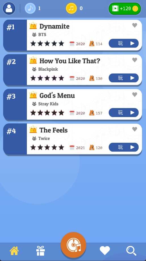 1、首先我们进入kpop钢琴块游戏中,在开始游戏之前我们先选择自己喜欢的音乐;