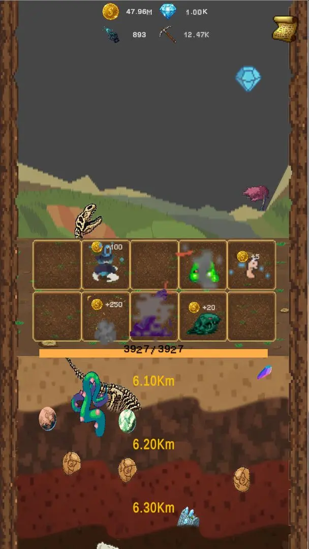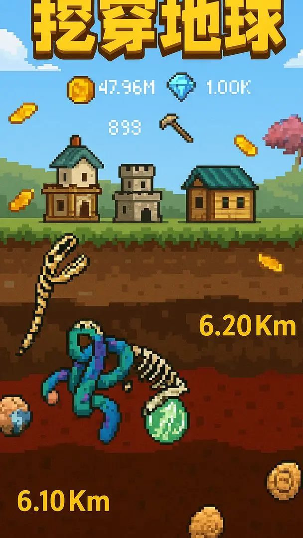 挖穿地球是一款采用像素风进行呈现的休闲益智游戏,玩家可以通过点击的形式在其中快速进行挖掘的操作,多种不同的任务内容可以选择,玩家可以从地表逐步进行挖掘的操作,在这里获取到更多不同的道具。支持使用获取到的资源对其中的设施进行建造升级,提升整体的科技水平,在这里更好的进行挑战。支持快速进行工人的招募,帮助你更好的进行战斗能力的提升,其中不同的内容可以选择,你需要做的就是不断进行挖掘的操作。