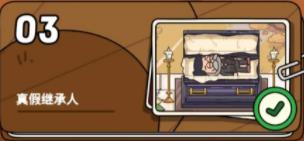 物品:合照(从尸体身上拿走烟斗,回到小说家的公寓,用壁炉的火点燃烟斗,根据桌上的提示,用烟斗把水果烧掉,得到密码0811,打开书架上的密码箱,得到合照),隐形眼镜(打开公寓的冰箱,取出洋葱用灶台的刀切开。回到殡仪馆用洋葱熏3个女儿,女儿C的美瞳掉后拍照),金色的头发(用殡仪馆门口的水桶浇AB,B头发掉色后拍照)
