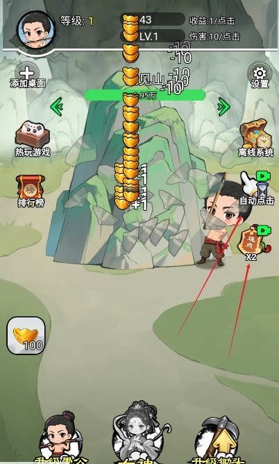 1、玩家通过点击来挖掘大山,大山会产出资源我们使用资源升级锄头。
