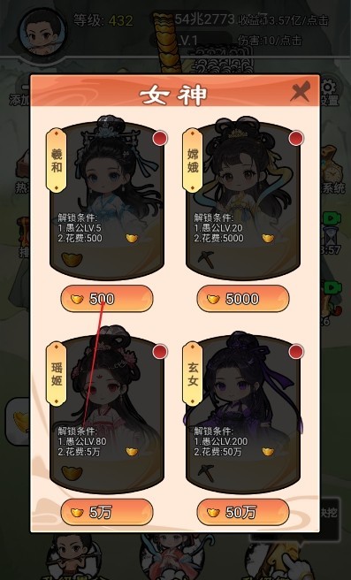 4、还可以召唤女神来帮助你移山,为我们带来大量的属性,提高收益