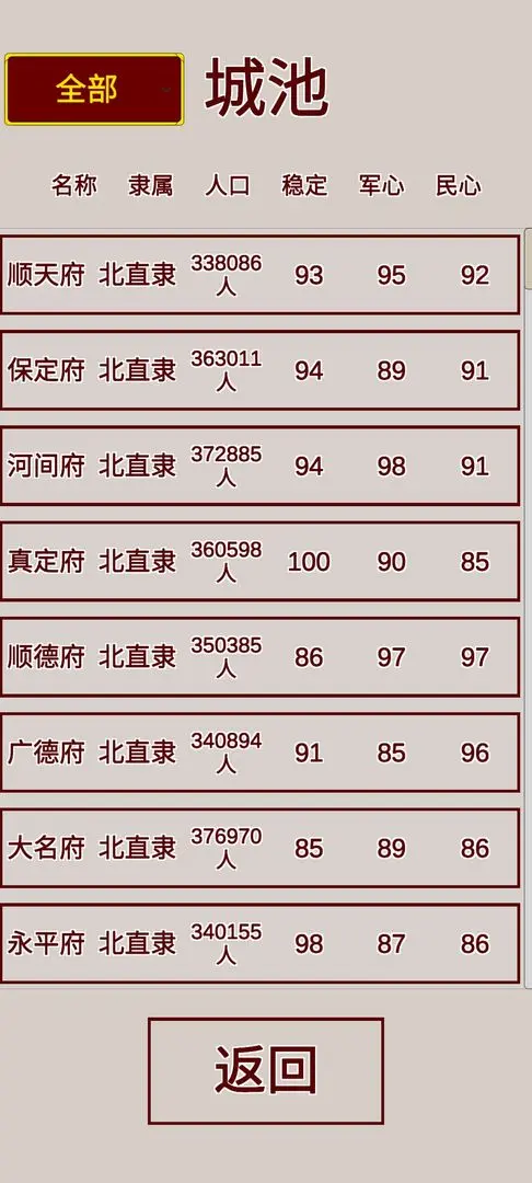7、自立后板块全重做吧,纯属啥也不是。有人玩他真是我大哥。大明没反应我理解,毕竟小游戏,这种ai不好做。但宏观微观总要结合一下,能看到下大明和我国实力对比。每年搞个平叛,消耗下军力。统一一个布政司有个颜色变化。孤军深入的有个战力削弱,反正我第一天就占领顺天府了。对,各府民兵商农一点区别没有,分它啥意思?